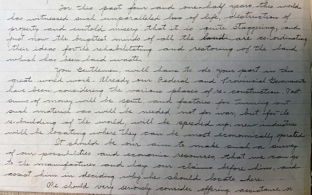 You Gentlemen, will have to do your part in this great world work. Already your Federal and Provincial Governments have been considering the various phases of re-construction. Vast sums of money will be spent, and factories for turning out such material as will be needed, not for war, but for the re-building of the world, will be speeded up, new industries will be locating where they can be most economically operated.