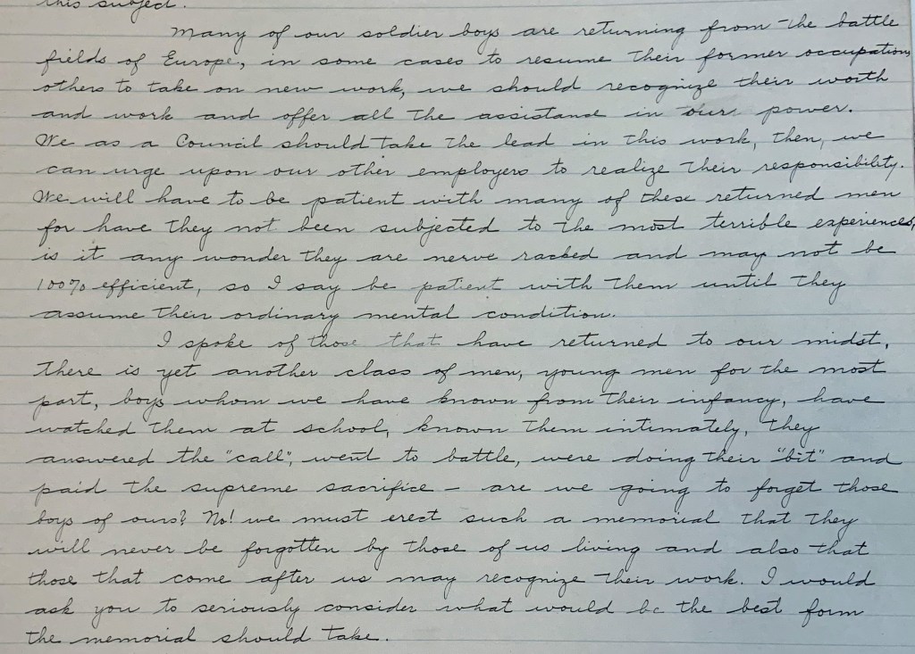 Many of our soldier boys are returning home from the battle fields of Europe, in some cases to resume their former occupation, others to take on new work, we should recognize their worth and work and offer all the assistance in our power. We as a Council should take the lead in this work, then, we can urge upon our other employers to realize their responsibility. We will have to be patient with many of these returned men for have they not been subjected to the most terrible experiences, is it any wonder they are nerve racked and may not be 100% efficient, so I say be patient with them until they assume their ordinary mental condition.I spoke of those that have returned to our midst, there is yet another class of men, young men for the most part, boys whom we have known from their infancy, have watched them at school, known them intimately, they answered the “call”, went to battle, were doing their “bit” and paid the supreme sacrifice – are we going to forget those boys of ours? No! we must erect such a memorial that they will never be forgotten by those of us living and also that those that come after us may recognize their work. I would ask you to seriously consider what would be the best form the memorial should take.