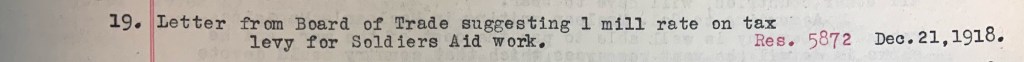 The City Council received a letter from the Board of Trade suggesting a 1 (one) mill rate (a percentage or amount) of the tax levy will go towards for Soldiers’ Aid work (i.e. a percentage of municipal taxes will go to this charity).