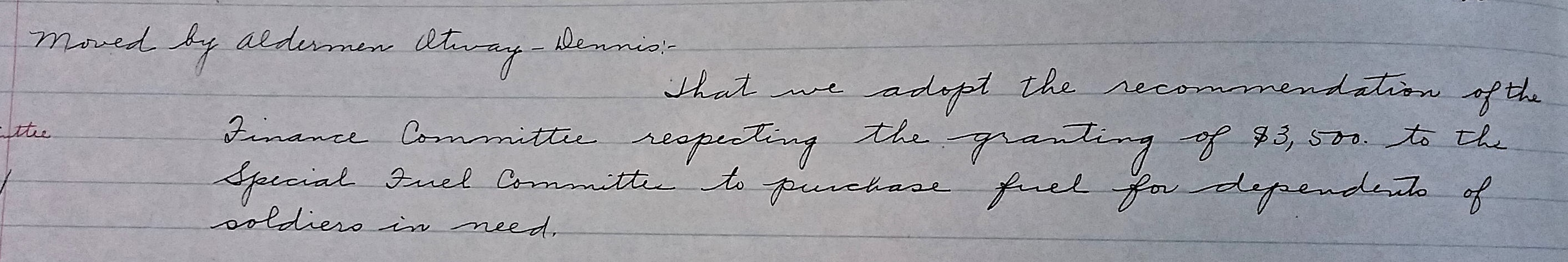 The Finance Committee suggests the Council grant $3,500 ($45,774.51 in today’s dollars) to the Special Fuel Committee so they can purchase fuel for the dependants of soldiers in need. During the war, there was a fuel shortage in Canada due to the fact that fuel sources were being used at home and overseas, so many families could not afford fuel as the prices increased.
