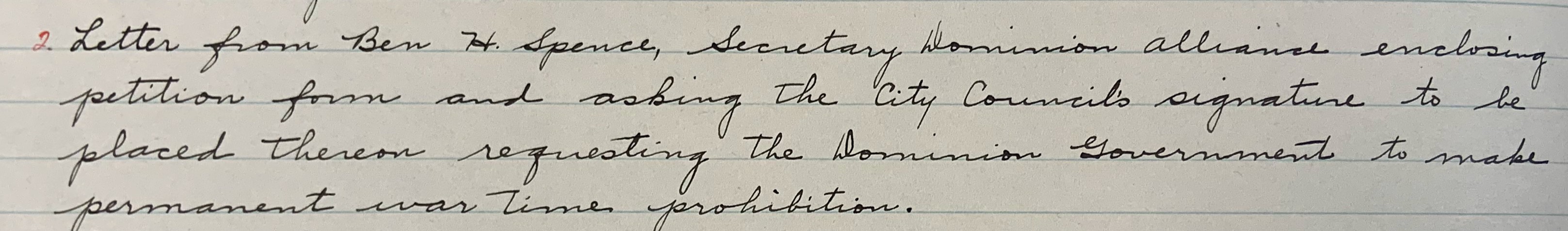 The Dominion Alliance for the Total Suppression of the Liquor Traffic was established in 1877. The Alliance wanted to prohibit all alcohol, which was done nationally during the war. The City of Fort William received a letter from the secretary of the Dominion Alliance with a petition for the continued permanent prohibition of alcohol. We are not aware of Council’s response, but prohibition was not made permanent after the war.
