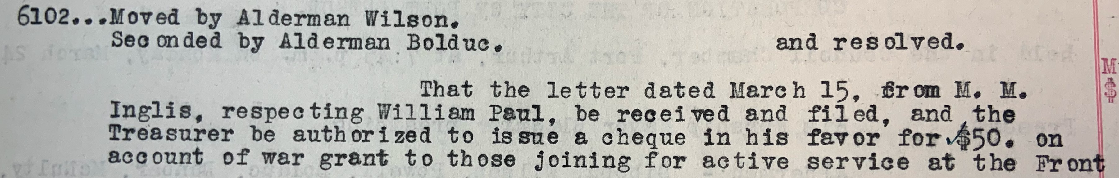 William Paul is issued his $50 war grant ($653.92 in today’s dollars) for enlisting in active service during the war. This was the amount given to single men who had been City employees when they enlisted.