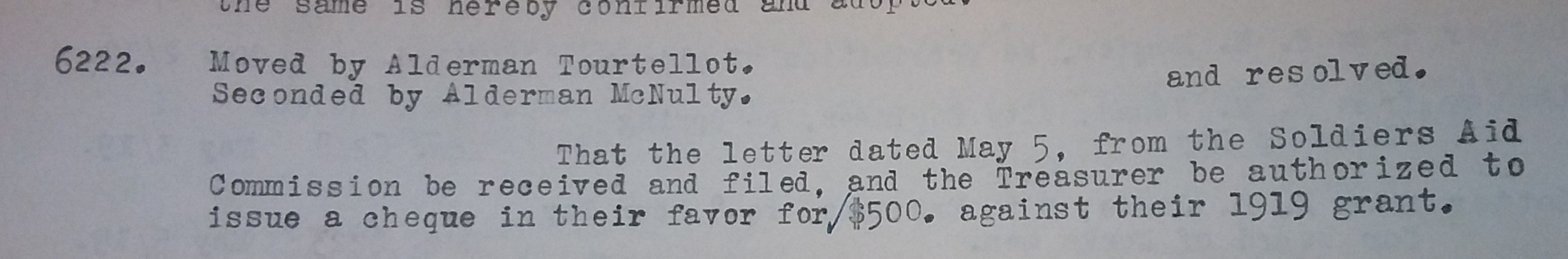The Soldiers’ Aid Commission is given $500 from their 1919 grant ($6,539.22 in today’s dollars).